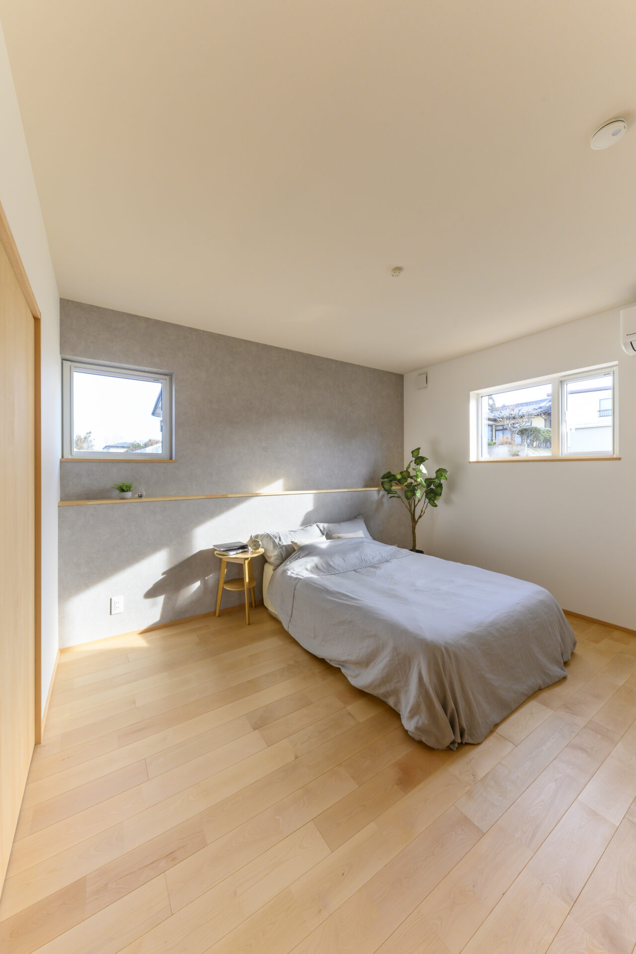 ●アクセントクロスで落ち着いた雰囲気の寝室。壁面1面を棚にすることで、必要なモノを置けるスペースも確保しています。