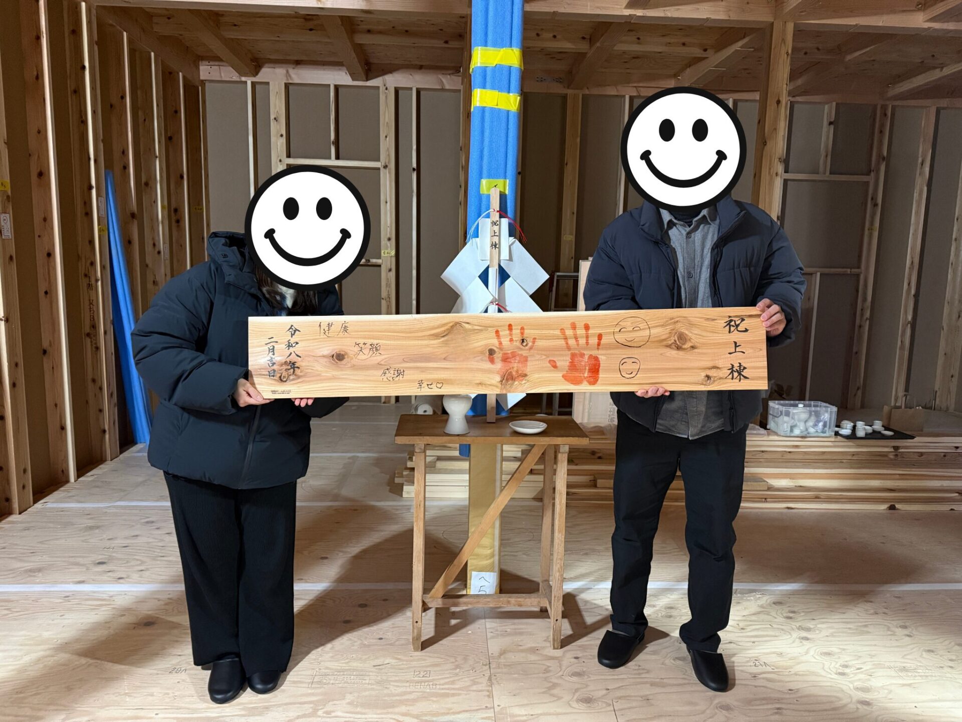 その後の上棟式では、お参りとお清めを行い、盃を交わしました。