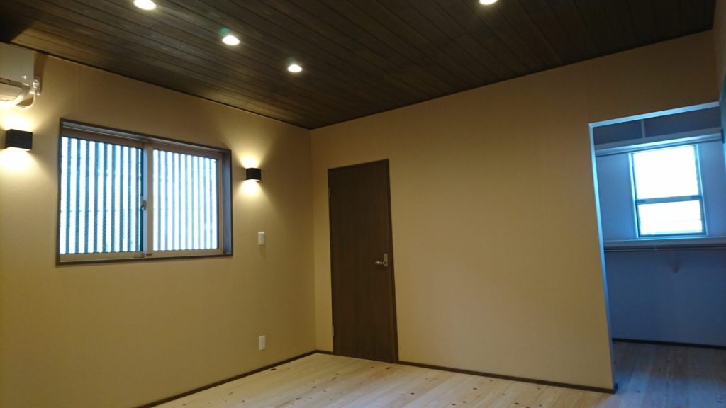 主寝室の床は檜、天井は杉板を貼りました。 壁面は和紙でこちらの空間もとても落ち着いた和モダンのインテリアになりました。