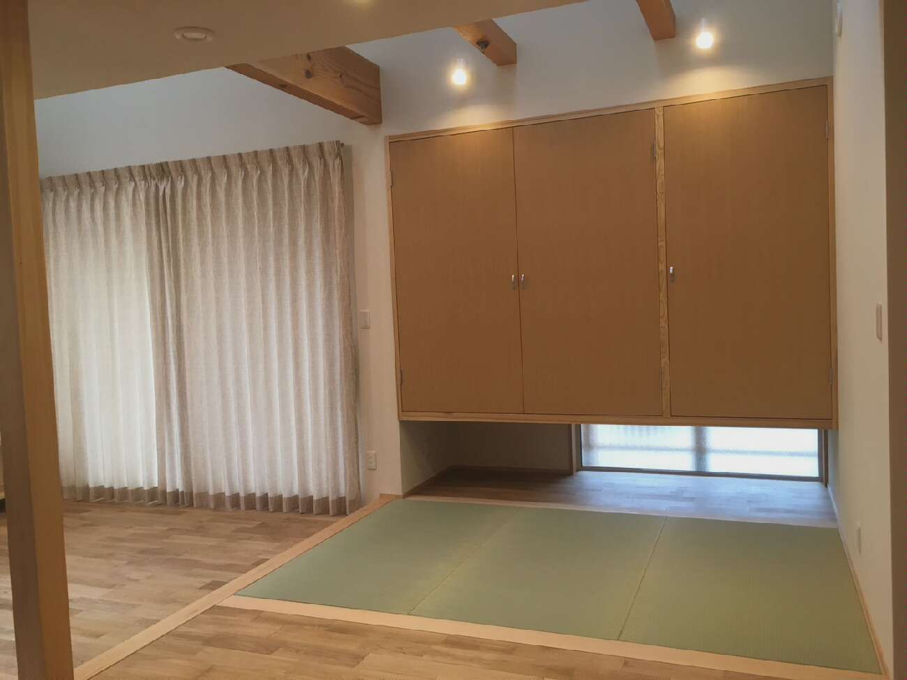 畳は縁なしのい草を採用しています。写真では分かりにくいのですが、リビングには段差があり、少し床面を下げた状態で作ってあります。 和室の収納も奥行があるのでたくさんの収納ができます。床面から少し浮かせて設置してあるので、収納下部は来客した方の一時的な荷物置き場や、お子様のおもちゃなどを収納できます。 生活に合わせて今後いろいろ活用できそうなスペースになりそうです。 リビングから上部を見上げると大きな吹抜けがあります。