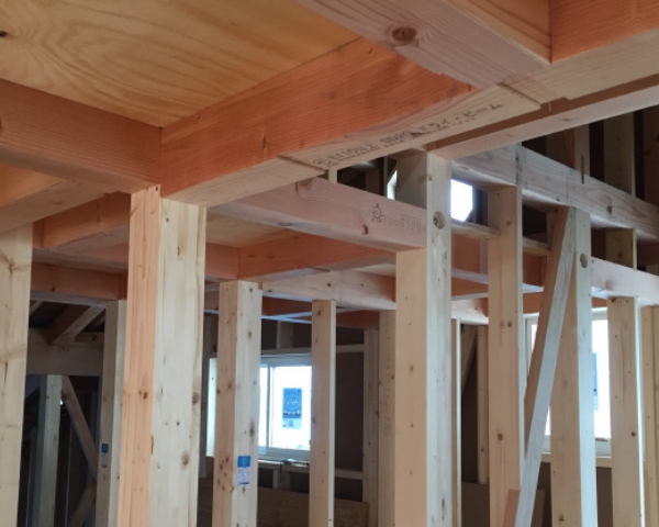 家を支える柱と梁。もっとも大切な構造躯体には、集成材ではなく信頼性の高い無垢材を使用しています。土台や柱には信州産のひのきや杉を使用し、梁には丈夫な米松を使用しています。創業以来培った大工の技術のひとつ、それぞれの木が持つ特性を理解し、適材適所で木材を組み、頑強で強固な構造躯体を作り上げます。