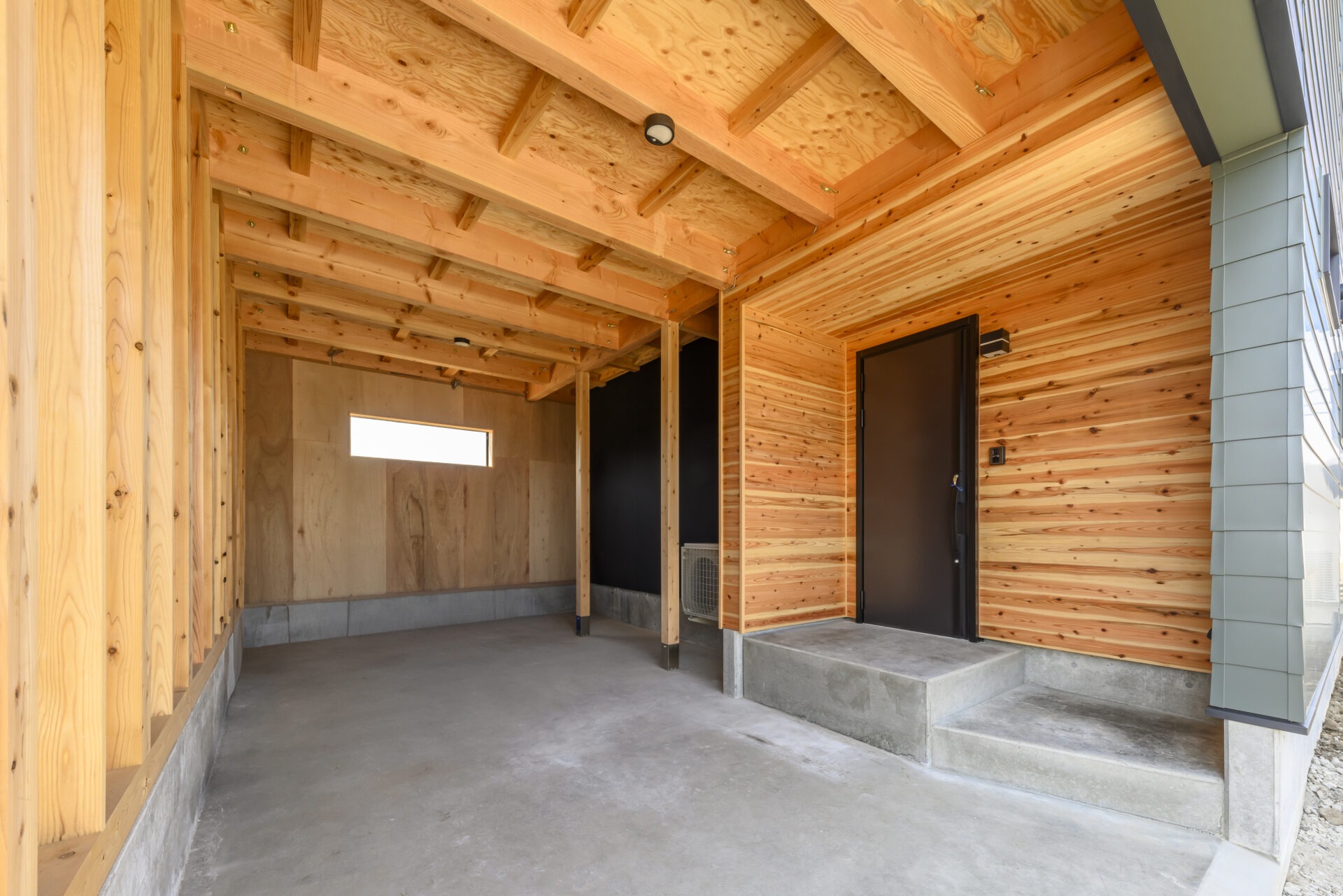 玄関周りにも杉の羽目板を施工しています。玄関先は土間仕上げにしています。