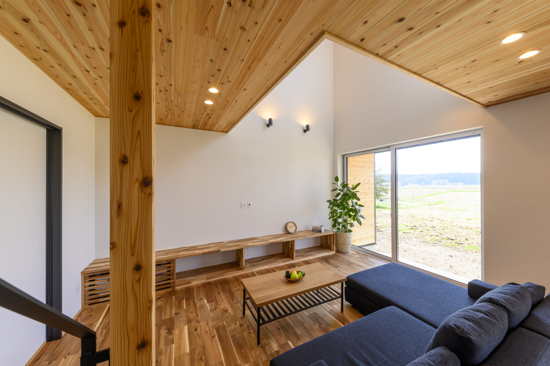 約20.7帖のLDK。吹き抜けからの明るい光が届く広がりを感じるLDKとなりました。床材にはアカシアを使用しています。