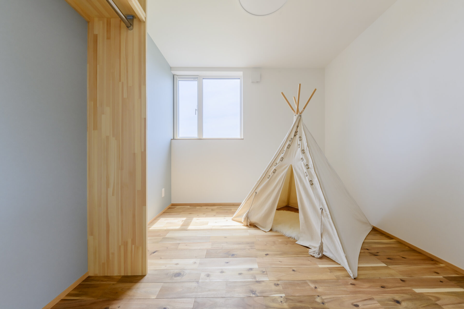 左右対称の子ども部屋。アクセントクロスの色を少し変えることで変化をプラスしています。ハンガーパイプも予め付けています。