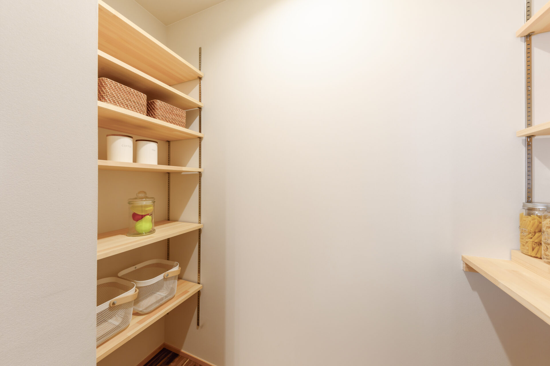 キッチン奥にはパントリーがあります。こちらも可動棚ですので配置も使い勝手も抜群です。