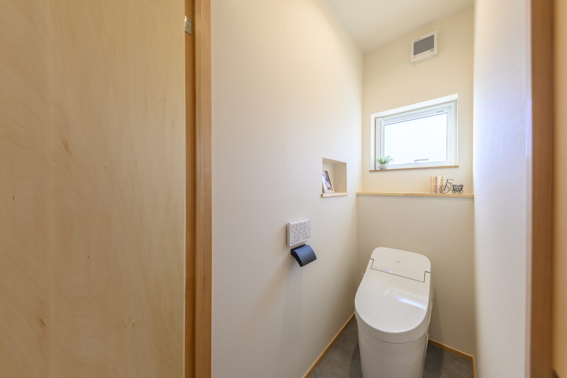 洗面脱衣室と隣接しているお手洗い。洗面台のすぐ隣に配置することで、お手洗いの中に洗面は設けていません。
